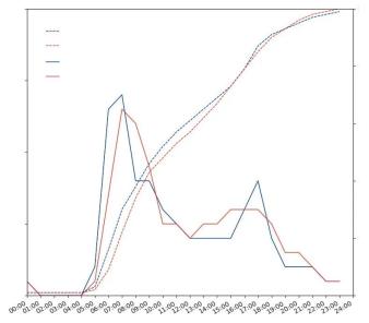 如图1所示,以概率密度曲线和累积分布曲线,全面展示新能源汽车出行起始和终止时间上的两类新能源汽车出行特征。图中蓝色部分为发生交通事故的新能源汽车出行起始和终止时间的概率密度曲线和累积分布曲线;红色部分为未发生交通事故的新能源汽车出行起始和终止时间的概率密度曲线和累积分布曲线。从图中可知:一是从两类新能源汽车的概率密度曲线和累积分布曲线的总体趋势看,出行起始时间呈右偏分布,出行终止时间呈左偏分布,可理解为两类新能源汽车的出行起始时间主要集中在上午、出行结束时间主要集中在晚上,符合当前新能源汽车拥有者的正常出行逻辑。二是从两类新能源汽车的概率密度曲线和累积分布曲线的时序特性看,发生交通事故的新能源汽车分别有两次出行起始高峰和出行终止高峰,即出行起始时间集中在5~12时和15~19时、出行终止时间集中在6~8时和15~22时;而未发生交通事故的新能源汽车主要有一次出行起始高峰和出行结束高峰,即出行起始时间集中在5~12时、出行终止时间集中在15~22时。三是从两类新能源汽车的概率密度曲线和累积分布曲线的峰值分布看,发生交通事故的新能源汽车出行时间较为不固定,且开夜车的比例大于未发生交通事故的新能源汽车。