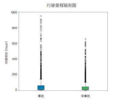 图2为新能源汽车出行时长和出行里程箱形图。其中,浅蓝色部分为发生交通事故的新能源汽车出行时长和出行里程分布箱形图;绿色部分为未发生交通事故的新能源汽车出行时长和出行里程分布箱形图。从图中可知:一是对比两类新能源汽车的箱形分布,发生交通事故的新能源汽车出行时长和行驶里程的总体水平要高于未发生交通事故的新能源汽车。二是对比两类新能源汽车的箱形峰值,发生交通事故的新能源汽车的极端值数量明显大于未发生交通事故的新能源汽车。从上述图1和图2可知,发生交通事故的新能源汽车与未发生交通事故的新能源汽车出行特征差异性十分明显,这有助于构建基于车辆轨迹的新能源汽车出行时空特征,以及进一步定量分析新能源汽车出行轨迹与其交通事故之间的内在关系。