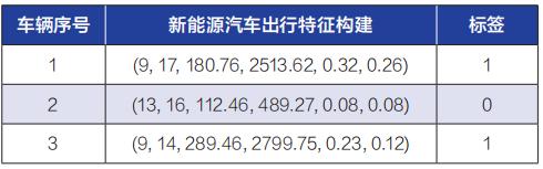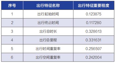 为了验证本文构建的新能源汽车出行特征与交通事故之间的内在关系,依旧选取2020年百余辆有交通事故记录的新能源汽车在当年第四季度的卡口过车轨迹作为发生交通事故的新能源汽车出行数据集,以及未发生交通事故的新能源汽车出行数据集为随机选择的2020年没有交通事故记录的约150辆新能源汽车在第四季度的卡口过车轨迹作为样本数据集。根据表1定义的新能源汽车出行特征指标,按序计算新能源汽车出行特征指标向量,将发生事故的新能源汽车标签设为“1”、未发生交通事故的新能源汽车标签设为“0”,摘取部分样本数据见表2所示,然后利用决策树算法计算各出行特征重要性,量化各出行特征对交通事故发生的影响程度,计算结果见表3所示,验证了新能源汽车出行特征构建的合理性。