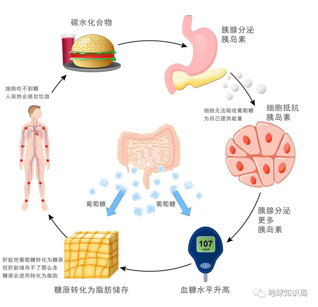 胰岛素是一种储存型激素,能够将过量的血糖转化为糖原,但肝脏储存糖原的空间有限,多余的糖原将被转化成脂肪。而胰岛素抵抗会与胰岛素分泌形成一种恶性循环,导致胰岛素水平越来越高。胰岛素分泌和胰岛素抵抗会使体重的平衡点上升,从而导致肥胖。