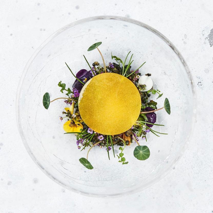 “秋日宇宙”菜品:烤蔬菜和烟熏蛋黄,配融化的西海奶酪。photo: ins@restaurant_geranium