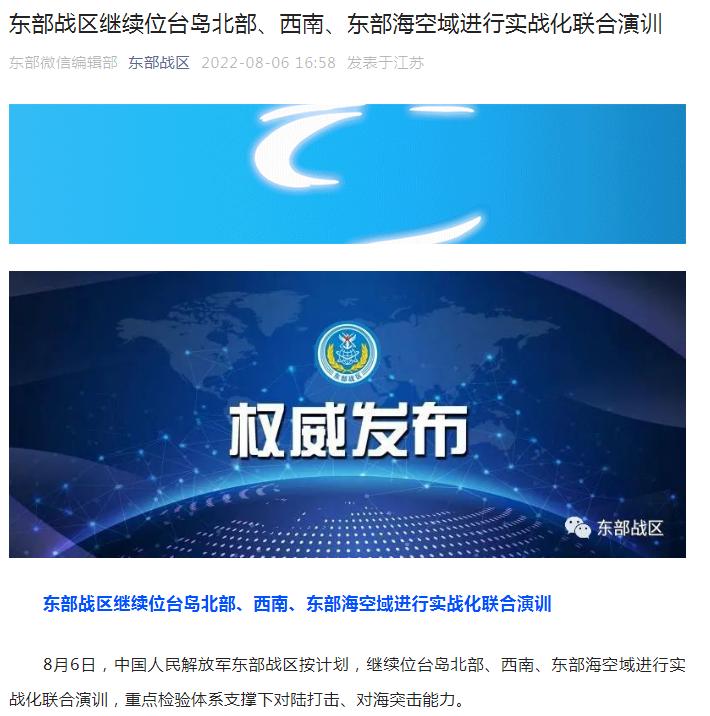 据东部战区消息,8月6日,中国人民解放军东部战区按计划,继续位台岛北部、西南、东部海空域进行实战化联合演训,重点检验体系支撑下对陆打击、对海突击能力。