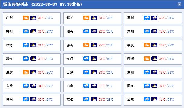 天气速览7日—8日,中南部市县多云,有分散(雷)阵雨,其余市县多云,局部有(雷)阵雨。最高气温:南部沿海市县29~32℃,其余市县33~36℃。