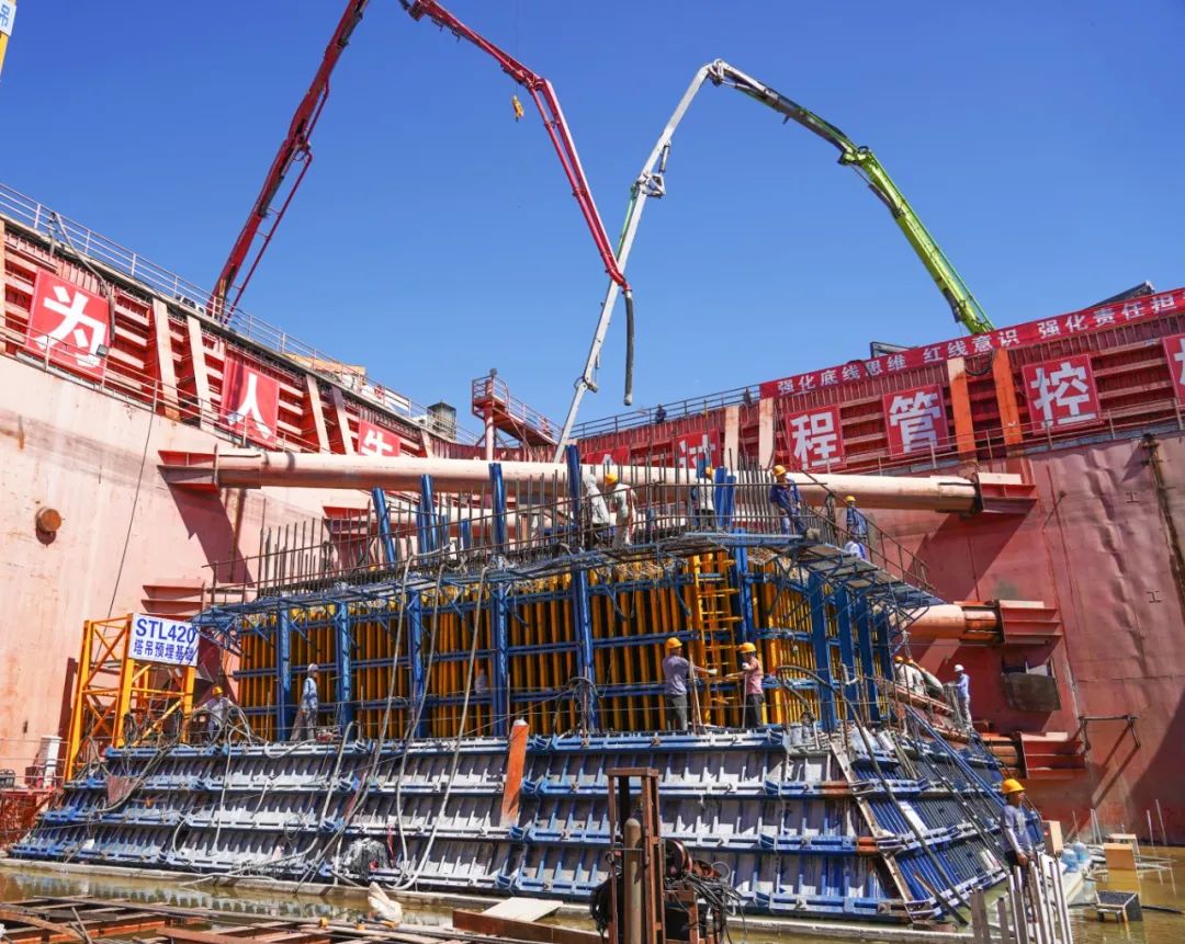 前期,南北两岸边塔3号墩和5号墩已经分别进入中塔柱和下横梁施工阶段,至此,全桥三座主塔已全部进入塔柱施工重要阶段。