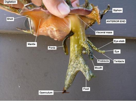 海螺各器官的位置,其中标注了眼睛的位置。