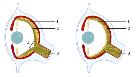 海螺的眼睛如下图所示,在脊椎动物(左边)的眼睛中,神经纤维(2)在视网膜(1)前面,这就意味着光要穿过神经纤维才能抵达视网膜,阻挡了一部分光线,造成了视网膜上有一块区域没法感光,便形成了盲点(4)。而在海螺和头足类动物的眼睛中,神经纤维在视网膜后面,便不会阻挡光线或破坏视网膜。