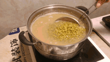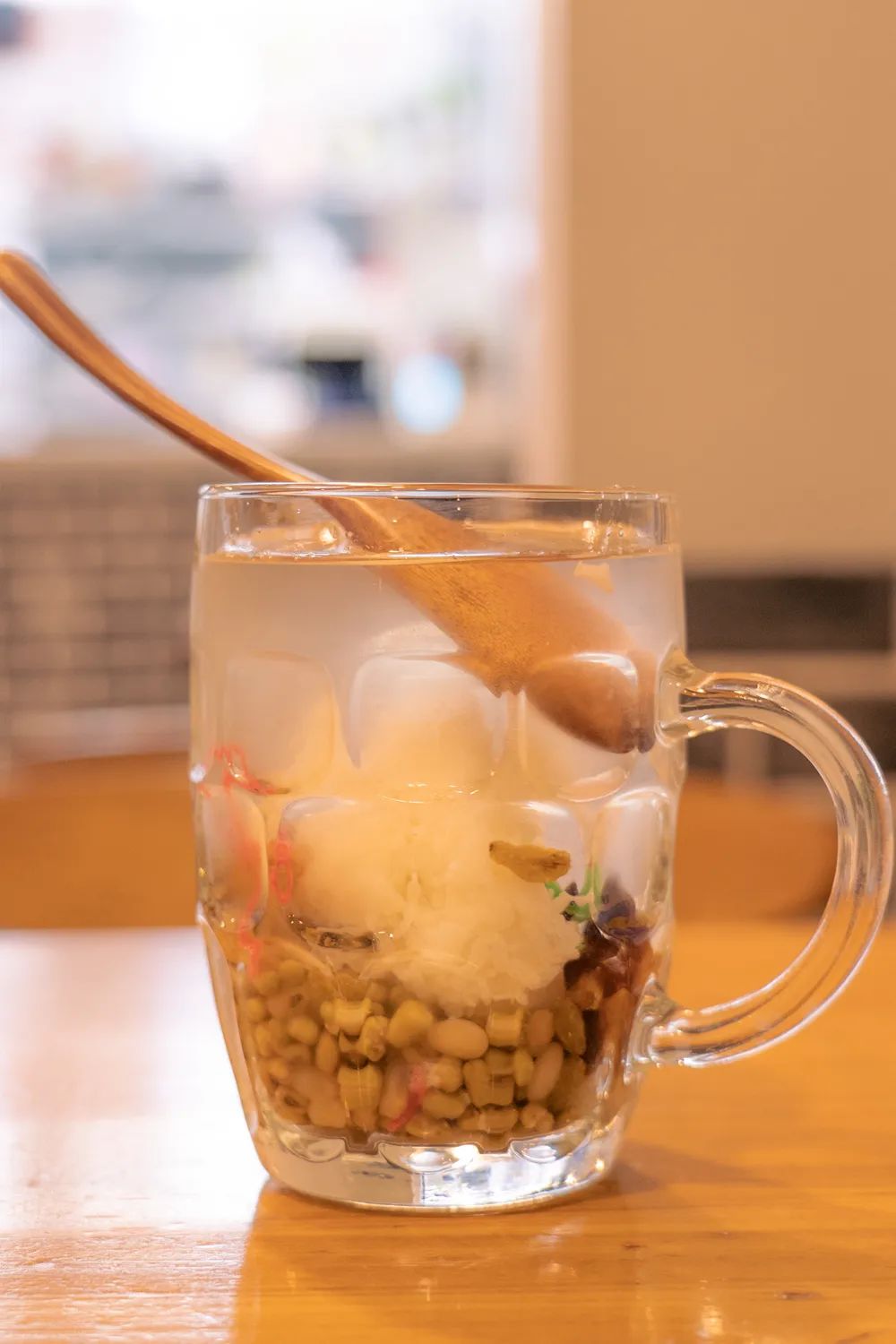 可以用扎啤杯装的绿豆汤,用料丰富,连碰杯都很有气势。