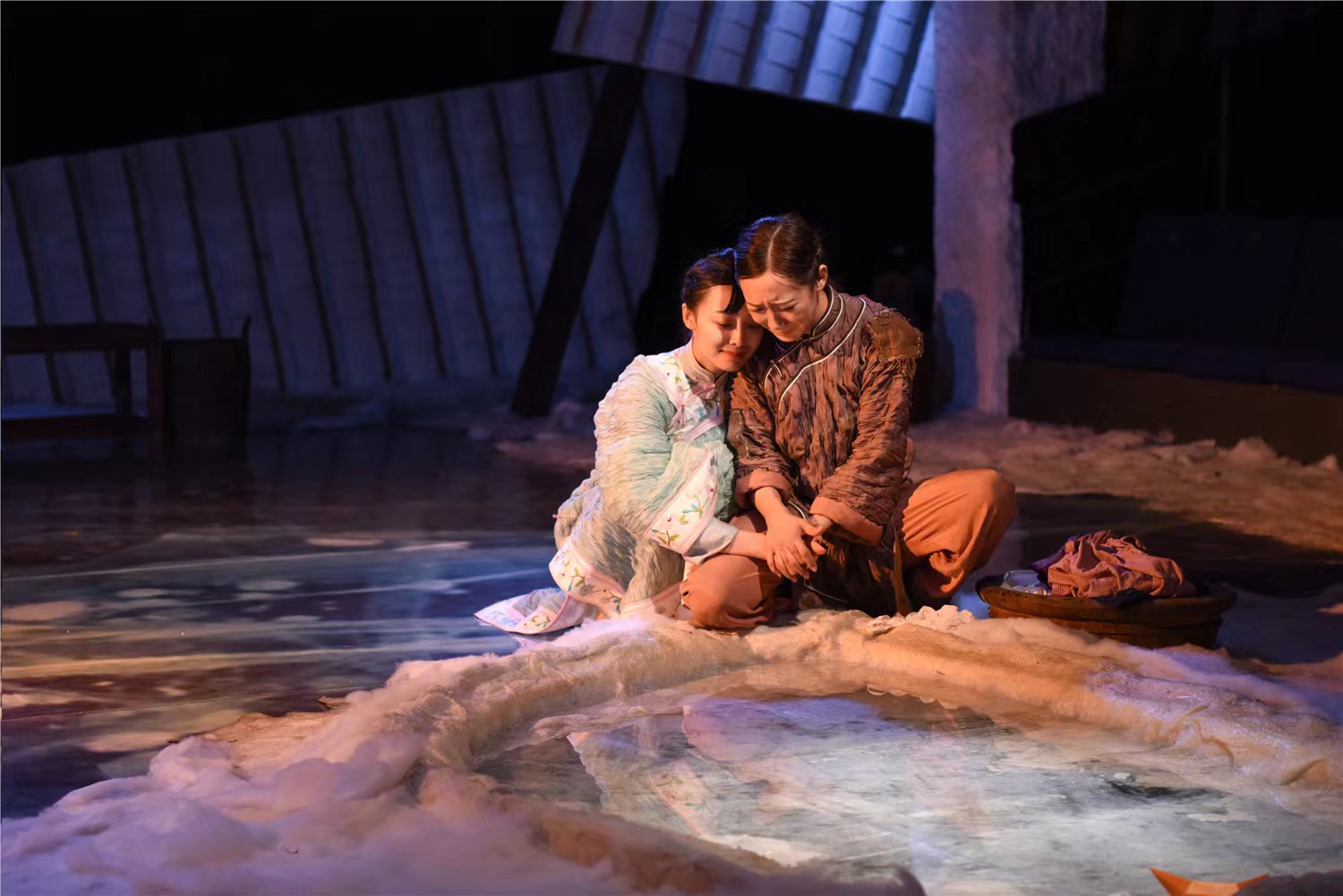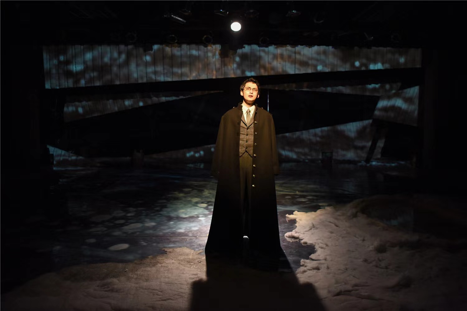 除却雪,舞台上的另外一半空间都被冰覆盖。其中还有些许坑洼不平,蓄着些水。冰面和池水会令人想起什么?北平的冬天?远航的轮船驶过大海?母亲辛劳洗衣的水盆?城外那池看似平静的湖面?以及,老舍最终举身赴清池的太平湖……在黄盈看来,演员演出全程都会于冰与水之间游走,“言所及和言所不及的,都在其中。你看到了什么,什么就是你。”
