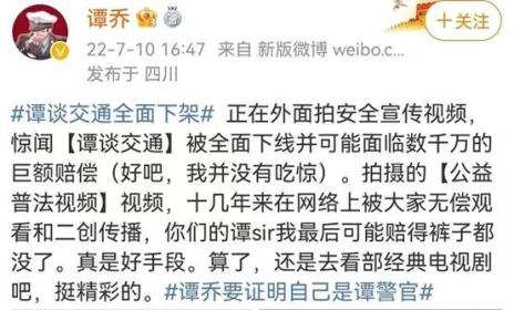 7月10日,《谭谈交通》栏目主持人谭乔发布微博称,该栏目视频被下线并可能面临千万赔偿,引发关注。