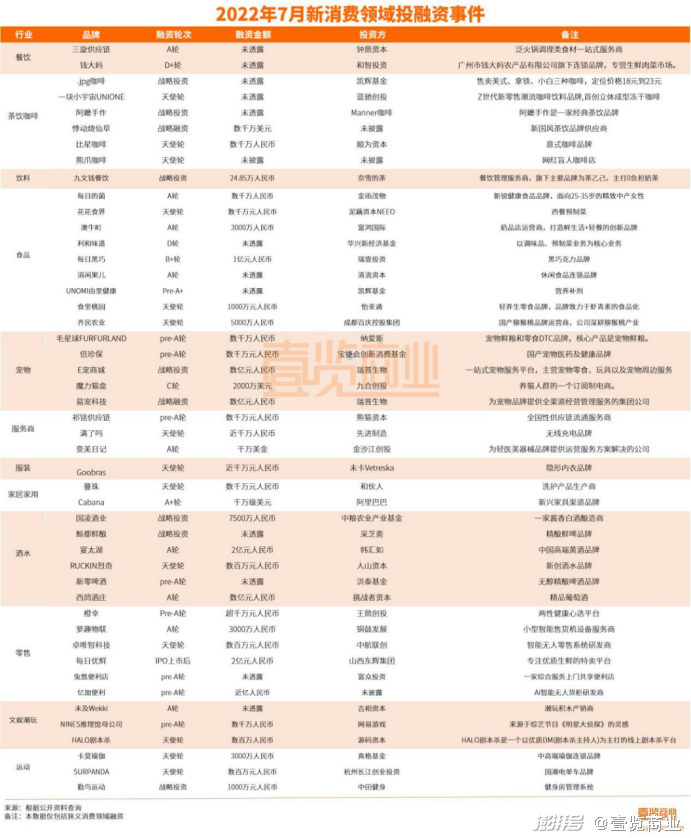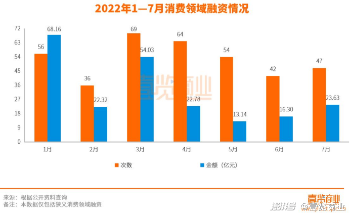 时隔两年,相较于2020年下半年的繁荣,2022年的消费赛道可以说是“跌入冰点”。虽然7月份整体的融资数量和融资金额较6月都有所上升,但消费赛道目前仍处于下行周期。