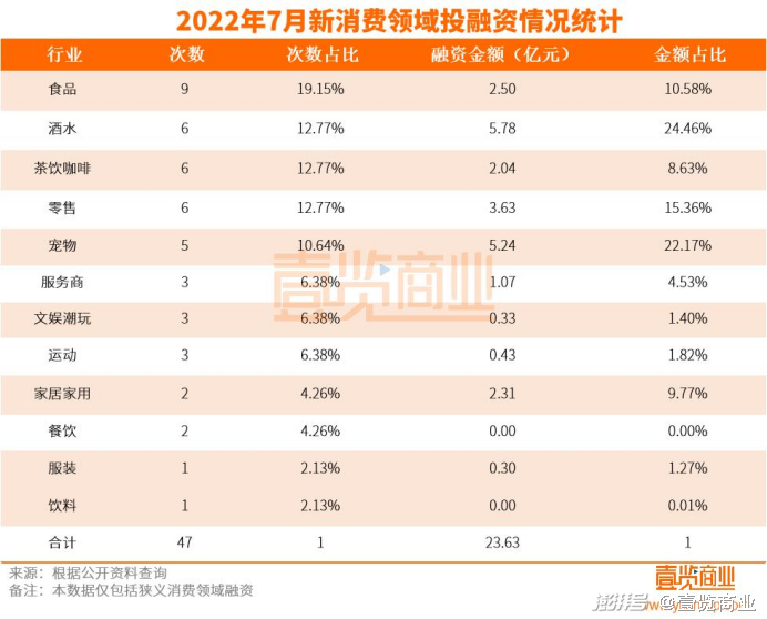 据壹览商业不完全统计,7月融资事件一共47起,融资金额约为23.63亿元。
