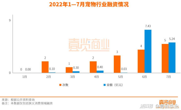 从壹览商业统计数据来看,宠物领域今年1-7月一共融资17次,13.5亿。从今年1月份开始,今年在该领域的融资次数和金额分别为:0起,0.00亿;2起,0.10亿;1起,0.30亿;2起,0.40亿;3起,0.03亿;4起,7.43亿;5起,5.24亿。可以看到今年宠物赛道逐步升温,在6月迎来高潮。