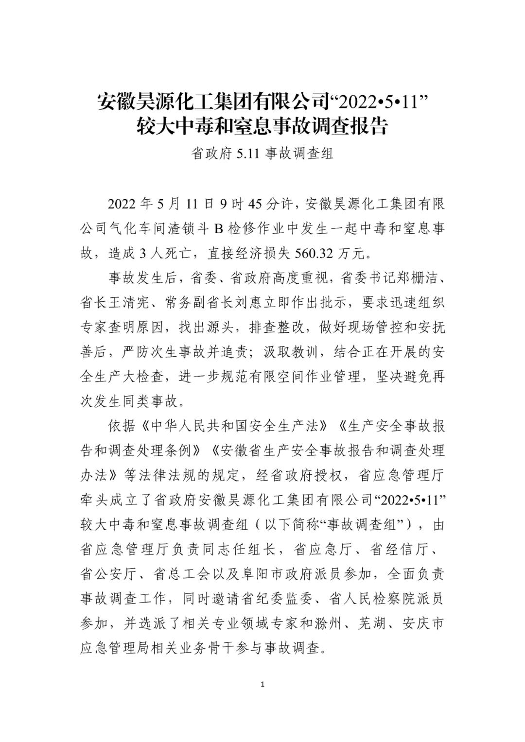 近日,安徽省应急管理厅公布了《安徽昊源化工集团有限公司“2022•5•11”较大中毒和窒息事故调查报告》。