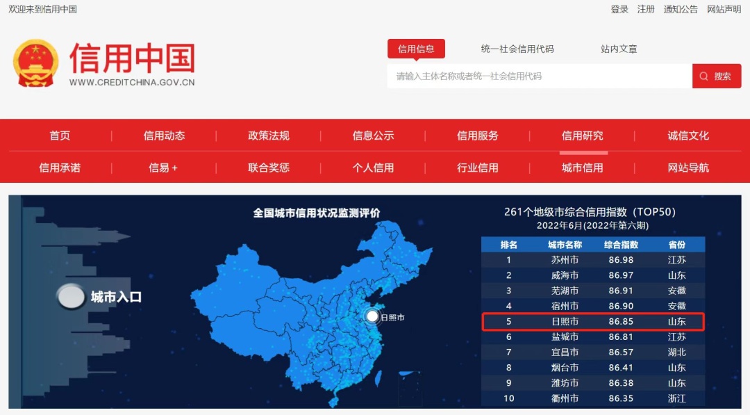 发布城市信用排名2022年第六期