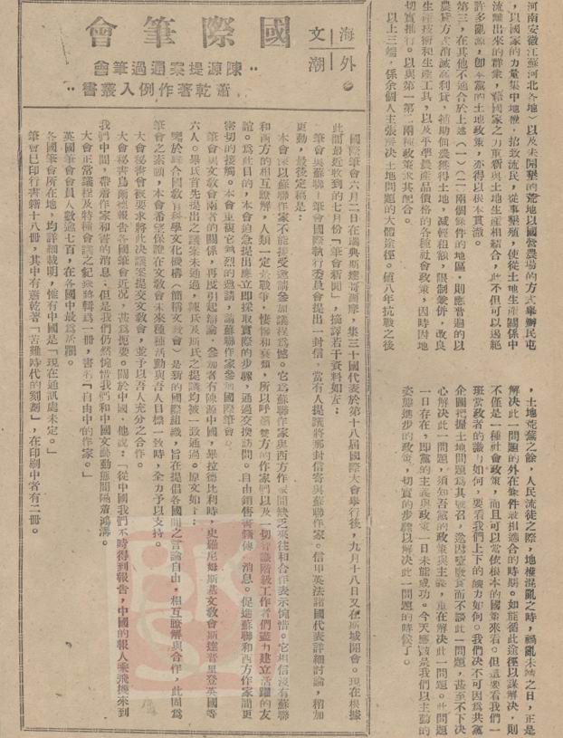 解放战争期间,因中国大陆发生惊天之变,对笔会的报道大为不同,如批评在1948年国际笔会第二十次大会上“反动派企图使大会成为反对新民主主义国家的场所,此种阴谋完全被击溃了。大会驳斥了英国及挪威的提案,该二提案对于捷克共和国尽了污蔑讥刺之能事。”次年,新华社报道了在威尼斯召开的第二十一次大会,“通过抗议战争宣传的决议称:‘大会参加者谨表示将在日常工作中维护和平、反对散布战争心理状态的决心,并代表不分其政治和宗教信仰与种族的知识分子,警言反对新战争的威胁,确信各国间的任何分歧与不和都是可以和平解决的。’”1949年后仍有关涉国际笔会的讯息,如1956年新华社报道了在伦敦举行的第二十八届大会,而国家意义上的中国作家回归国际笔会是在1980年。