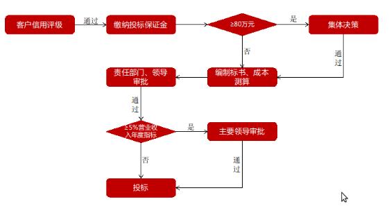 图4为保障企业高质量发展,规避投标风险,航天建设通过研究大量投标风险案例并参照现代化企业管理流程,制定投标管理方案,明确通过客户资信调查审批的项目方可参与投标。同时,要求所属各单位制定投标管理办法,建立投标管理审批流程,明确投标责任领导和责任部门,通过对投标项目成本、建设方案、投标文件、质量目标、项目工期及付款方式等方面审查或评审,结合当前市场方向、客户资信、盈利情况等方面给予投标意见,全面识别标前风险。“投标审批流程须按照项目的规模进行审批层级的划分,至少应经过本单位业务主管领导审批,标的金额大于本单位营业收入年度指标5%的项目应经过本单位主要领导审批”进一步确保投标前风险管控到位、组织管理到位。为确保将投标风险降到最低,严令各类超过80万元的保证金(或保函等同类风险抵押)项目须通过公司集体决策后方可投标,实现投标全过程“制度化管理、流程化运行、特殊问题特殊处理”的风险管控模式,为项目后续开展、企业良性发展奠定坚实基础。