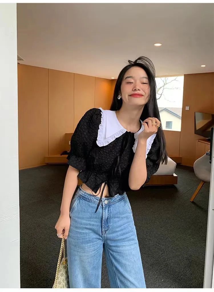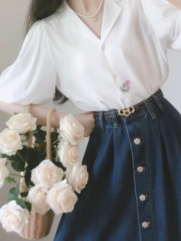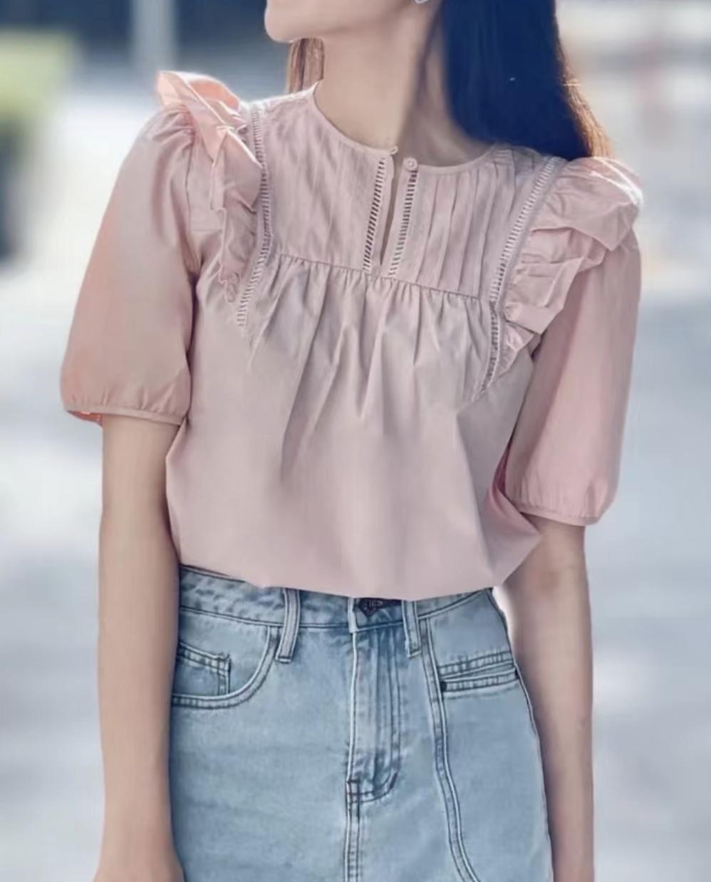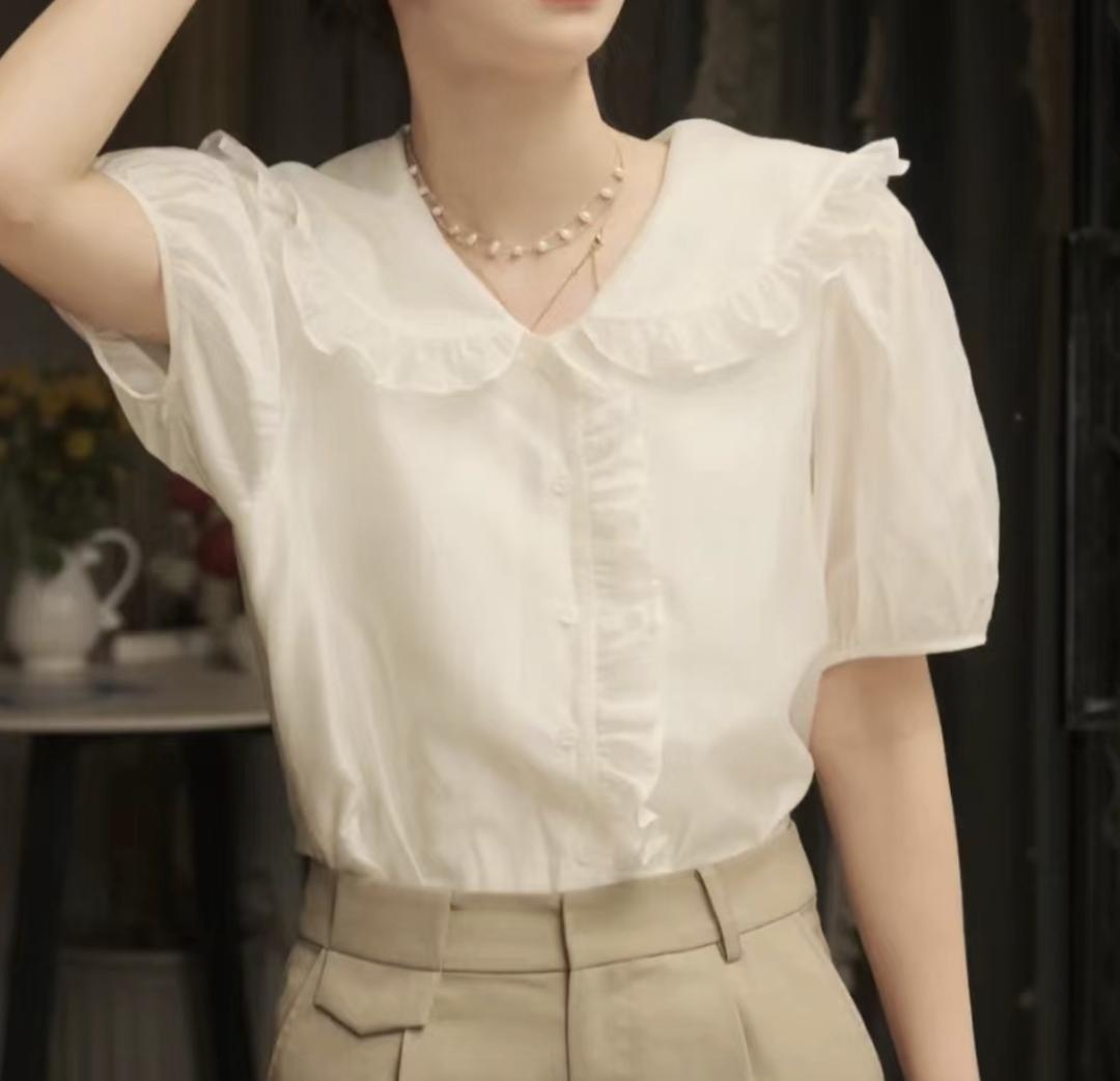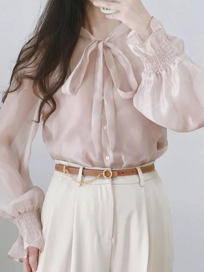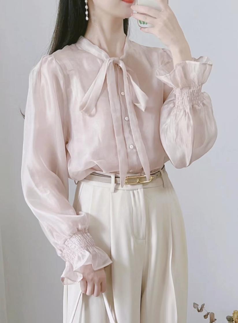 想要更透气轻薄一点的话,可以选雪纺布料的上衣。收口泡泡袖会显得更温柔,大翻领对胸部丰满的姐妹也很友好,对身材包容性也hin棒。