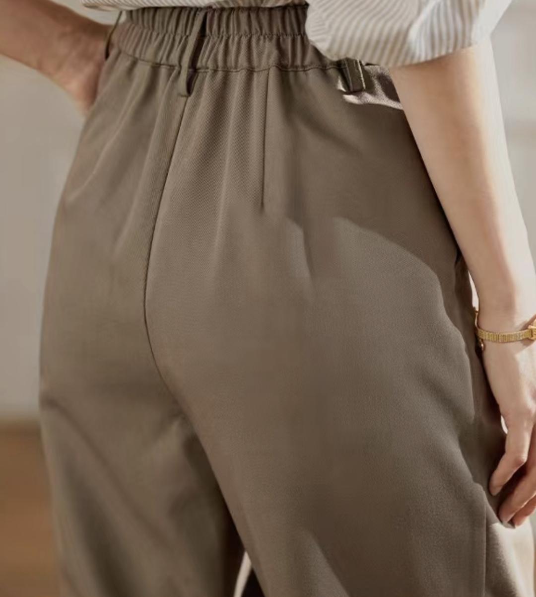 高腰萝卜裤堪称收胯神器,H型姐妹可闭眼入。调节腰臀比的同时还能修饰腿型,后面松紧小细节也很人性化,完全不用担心腰围问题。