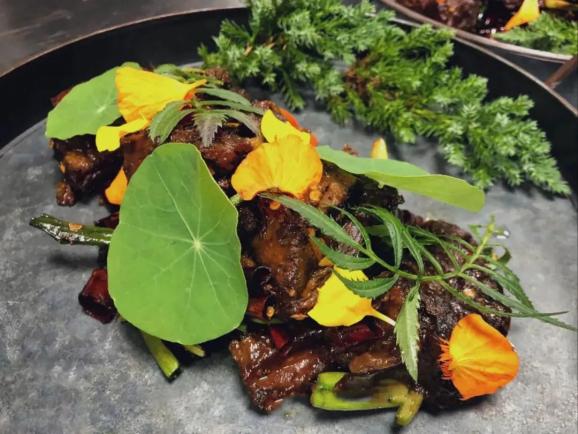 我把它和云南本地的野生菌和贵州的辣椒融合在一起,还加了缅甸香菜等香料,这样的搭配会让牛肉更有层次感,也更能激发牛肉本身的香味,很多客人吃完都想打包。