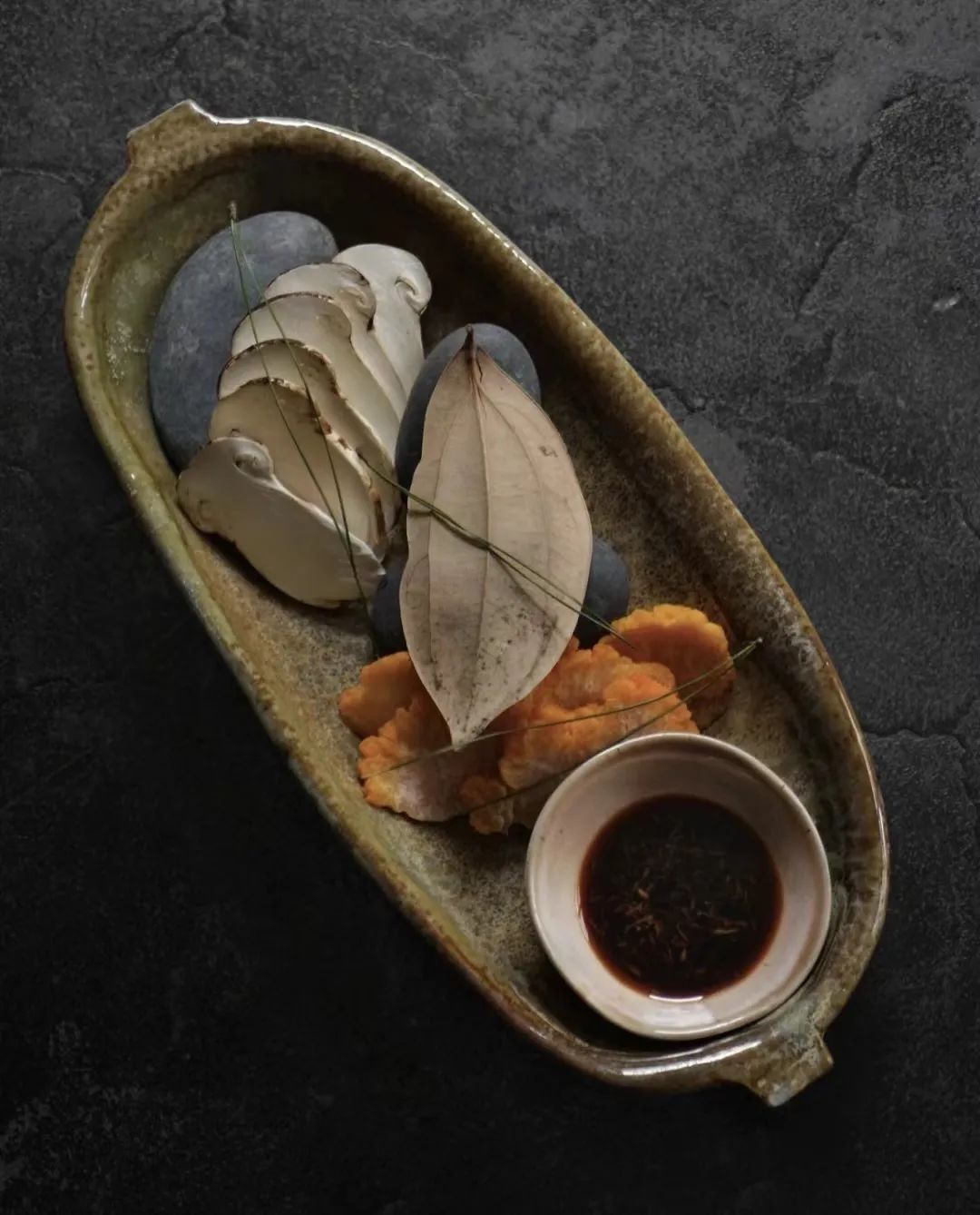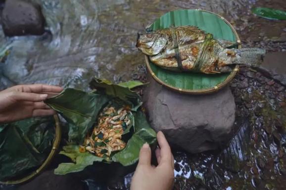 深入西双版纳雨林,我也学着当地傣家人在野外,砍下竹子当碗筷。宽大的芭蕉叶物尽其用,包裹着各种在地野生食材。香茅草烤罗非鱼、烤五花肉、竹筒土鸡汤,原始炙烤的香气热烈又直接,充满野性力量。