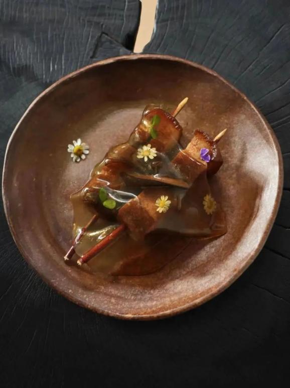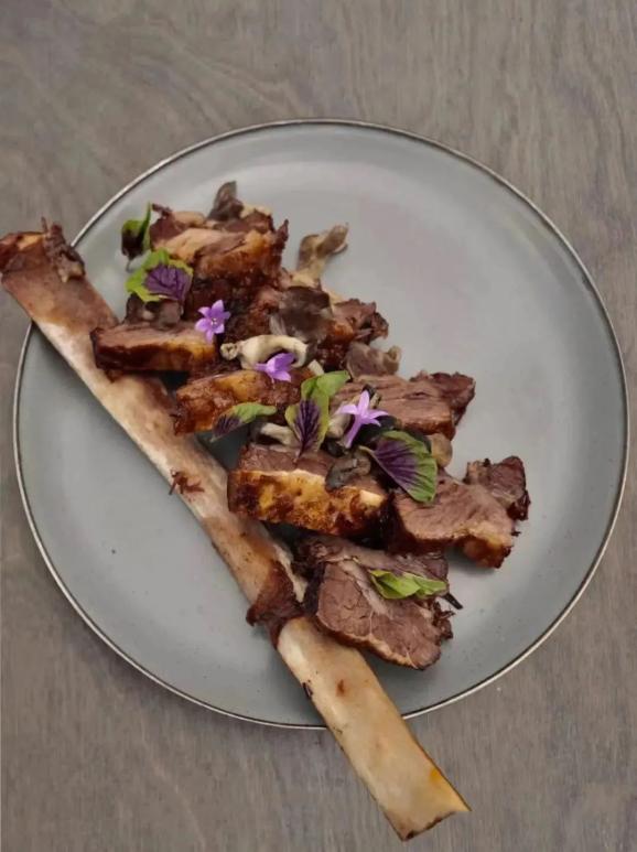 还有一道枣林溜达鸡,也来自宁夏中卫。它是被放养在枣林里,从小吃巨甜无比的枣子和枸杞长大的。我用烤制的方式来料理它,配上一些香草籽等香料,鸡肉自带枣香,口感细腻丰富。大理有个雪花牛,它是安格斯牛种,很早以前它就拿到云南来养殖了。这种牛肉的香味很足,也很有韧劲。