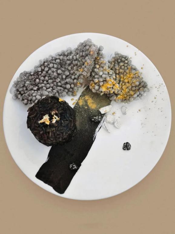 中餐里,很多菜品都是红绿黄,虽然展示了烟火气,但有时不够高级。我做一道菜之前,我会先考虑颜色,尝试做减法。比如我想要金色配黑色,那我就会思考什么食材是金色,哪个食材是黑色,它的味道是怎么样的,最后思考可以用的烹饪手法。这就像在做一道连线题,把你需要的素材连线搭配。