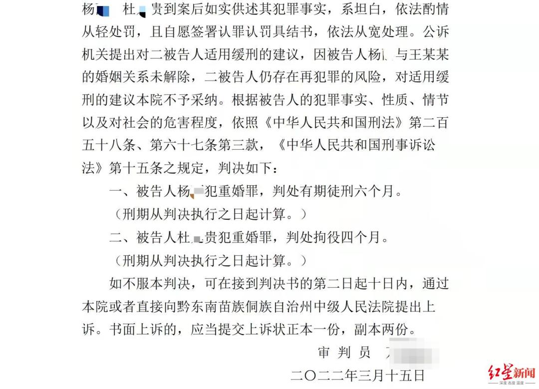 最终,杨、潘二人因触犯重婚罪被法院分别判处有期徒刑6个月、拘役4个月。二人未提起上诉,已服刑。