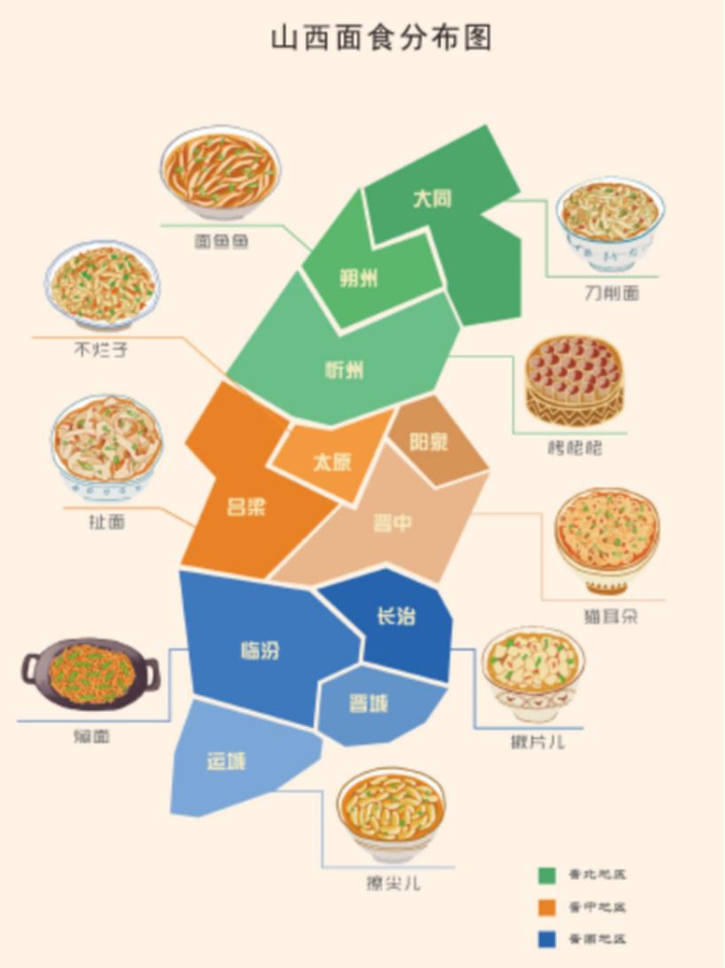 山西面食有很明显的区域分布特色,气候比较温和的晋中以及晋东南部,主要种植玉米、高粱;气候偏冷的晋北,主要种植荞麦、莜麦、大豆;比较“娇贵”的小麦,多在气候较暖的晋南才出现。