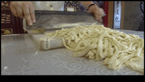 图丨《中华绝技》面条断面是小三棱形,本身又有一定的硬度,呼噜吸上一口,能感觉到面条之间根根分明,嚼起来仿佛面与面之间在互相抵抗,但力度又不过分,都能被牙齿切断。要是制作时用到了玉米面,面汤里还会带上玉米的香气。