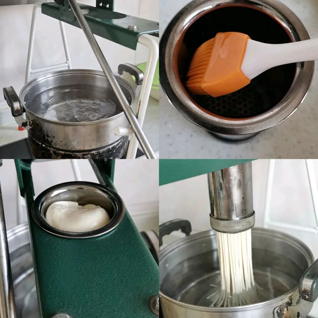 现在家庭里用的饸饹面机器 |豆果美食@紫色烟圈面条被压得很实,吃起来很有韧劲。每一根面条都是一样的粗细,“呼噜”吸上一大口,顺滑极了。再配上特制的汤汁,放上丸子和炸豆腐,表面撒上韭菜和油炸酸,爱吃醋的根据个人喜好再加点醋,味道又香又绝。