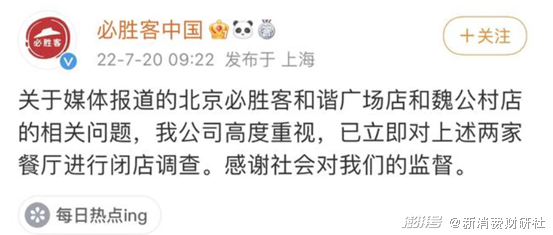 被曝光后,北京、无锡四家必胜客餐厅接连被立案。