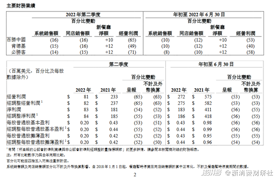 据财报显示,2022年第二季度,百胜中国实现营业收入21.3亿美元,同比下降13%,环比第一季度减少20%;实现净利润8300万美元,同比下降54%,环比一季度减少25%。