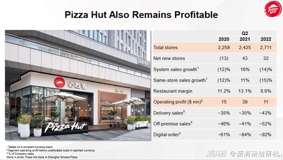 图片来源:百胜中国第二季度财报从时间线上的变化来看,2020年至2022年的第二季度,单从必胜客来看,总门店数从2258家一路上升到2425家和2711家;餐厅利润率分别是11.2%、13.1%和8.6%;数字订单(包括外卖订单、手机下单及自助点餐机订单)占公司餐厅收入分别是61%、84%和92%;外卖收入占公司餐厅收入分别是27%、29%和37%。