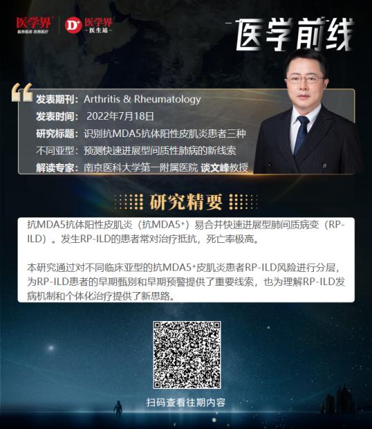 医学界:DM是一种以肌肉和皮肤损害为主要表现的系统性炎症性疾病。间质性肺疾病(ILD)是DM的常见并发症。其中,抗MDA5+DM易合并RP-ILD。发生RP-ILD的患者常对治疗抵抗,死亡率极高。请问其目前的诊疗现状是怎样的呢?