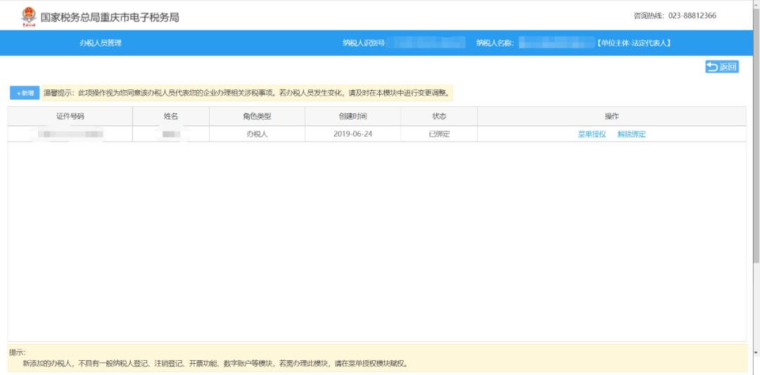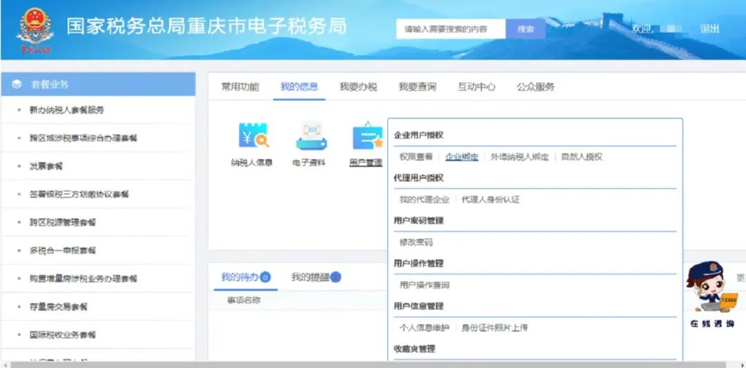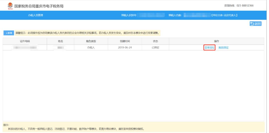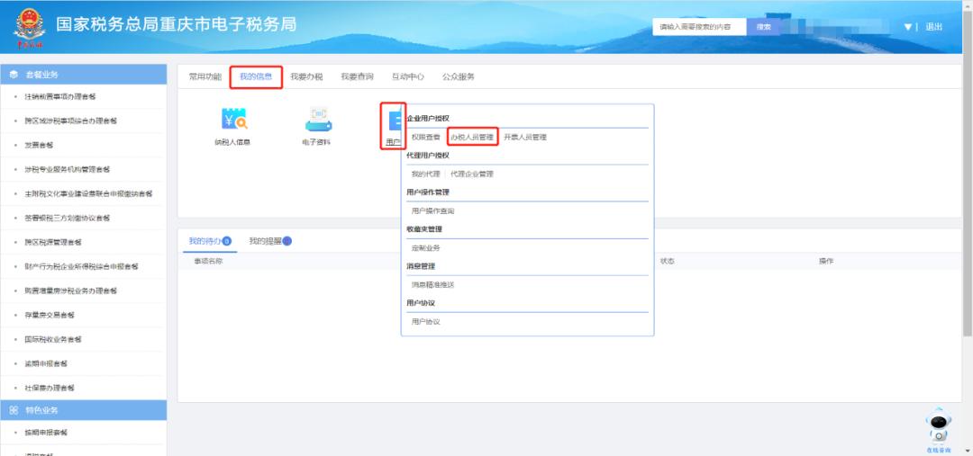 第二步法定代表人在电子税务局“用户管理-用户授权”中对财务人员/办税人员账户进行涉税事项授权管理。