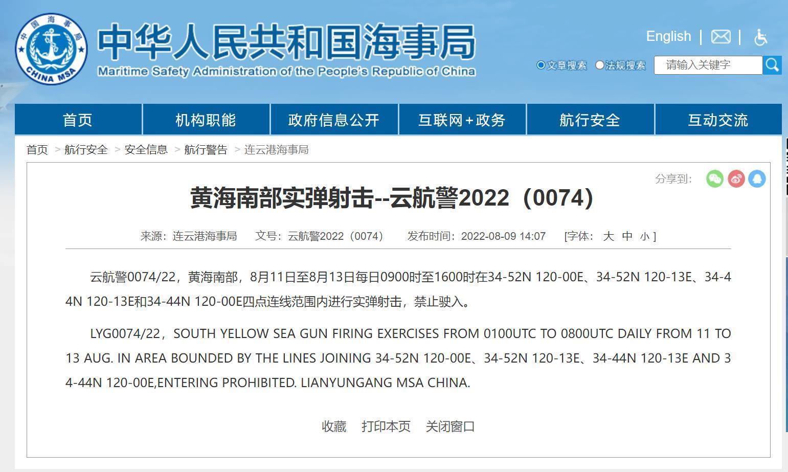 江苏连云港海事局日前发布航行警告,今起(8月11日)至13日每日9时至16时在黄海南部海域进行实弹射击,禁止驶入。