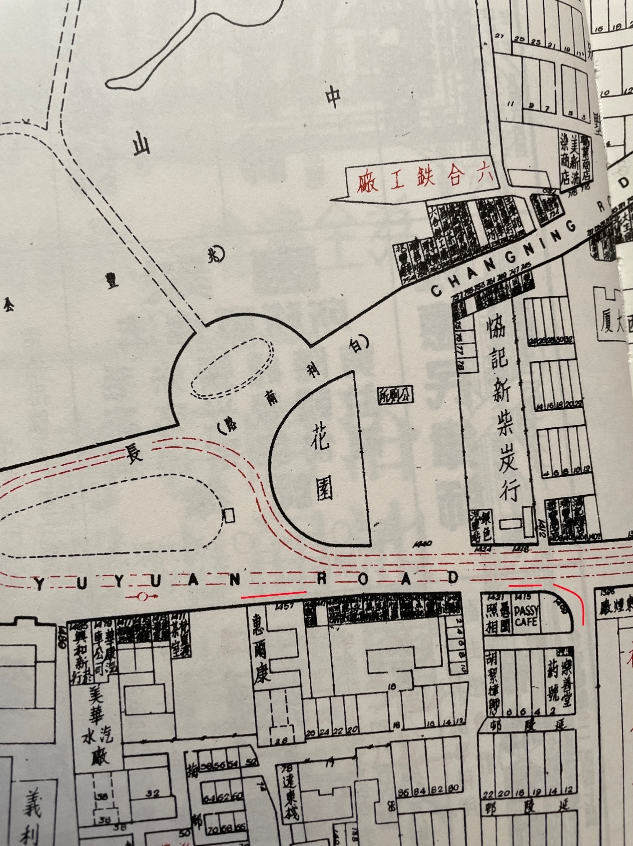 圣玛利亚女中在白利南路1187号(今长宁路1185号),兆丰公园(今中山公园)西南侧。当时兆丰公园共有三个出入口,北门直通圣约翰大学,南门则是正门。从1940年代的地图看,愚园路1415号确实就在兆丰公园正门马路的对面。1937年抗战开始,愚园路分店可能受战事影响,搬到1402号。张爱玲1931-1937年在圣玛利亚女中住读,1933年初开到附近的老大昌分店显然也出现在了她的中学生活里。圣玛利亚的管理很严格,每个月只放一天的假,因此只有借着每周她的保姆定期来送衣服和零食的机会,同宿舍的女孩子们才能保持“俄国小甜面包”的供应。