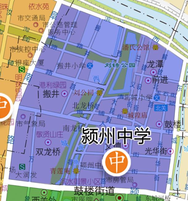 8.阜阳市城南中学:东至颍淮大道,北至卜子东路向南接西清路向东接柳林路,西至阜南路,南至润河路(待附近新建中学建成后,学区重新调整)。