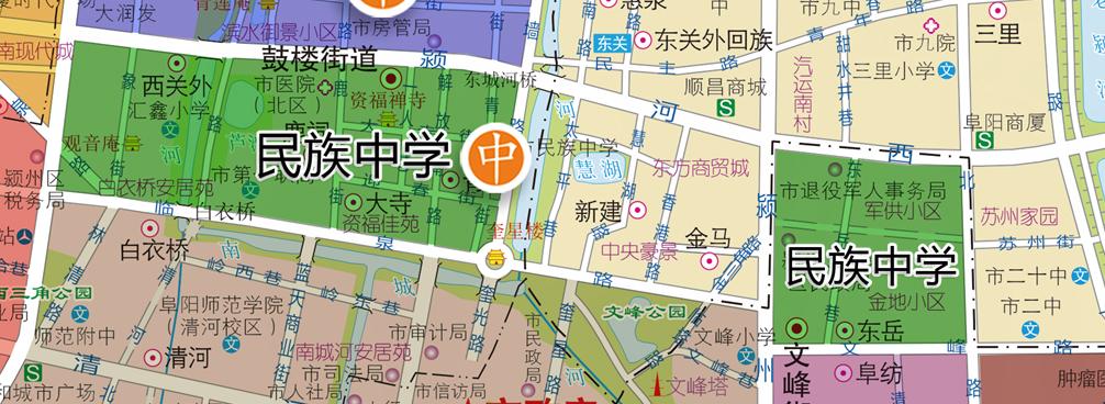 5.阜阳市民族中学:①东至东城墙路,南至临泉路,西至阜南路,北至颍河西路。