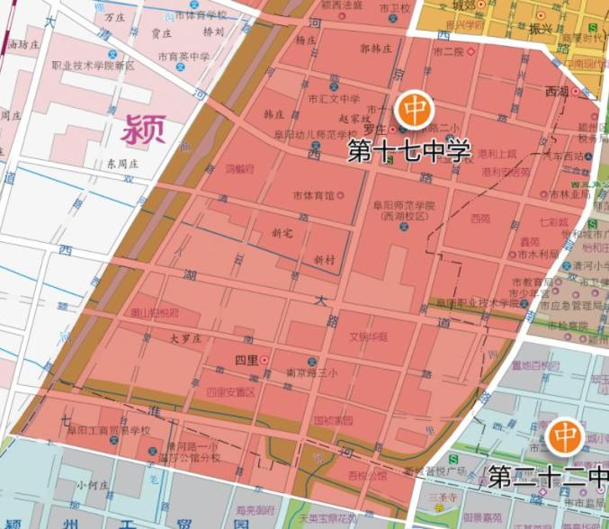 6.阜阳市第十七中学:东至阜南路向西接鑫泉路、颍河西路向北接南京路向西接人民西路向北接七渔河东路,南至卜子东路,西至霞光大道向东接颍河西路向南接七渔河,北至泉河。