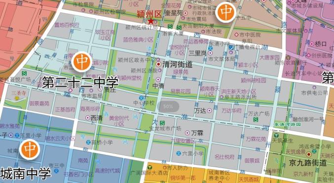10.阜阳市九里中学:东至颍上南路接南站路,南至润河路接京九路,西至颍淮大道,北至柳林路。