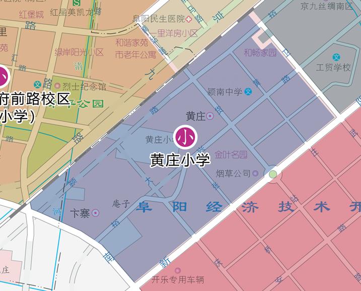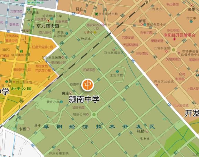 12.阜阳开发区京九路办事处颍南中学:东至京九路街道办事处辖区,南至京九路街道办事处辖区,西至颍州南路接柳林路接沙河路接南站路(京九路街道办事处辖区),北至新安路接淮河路。