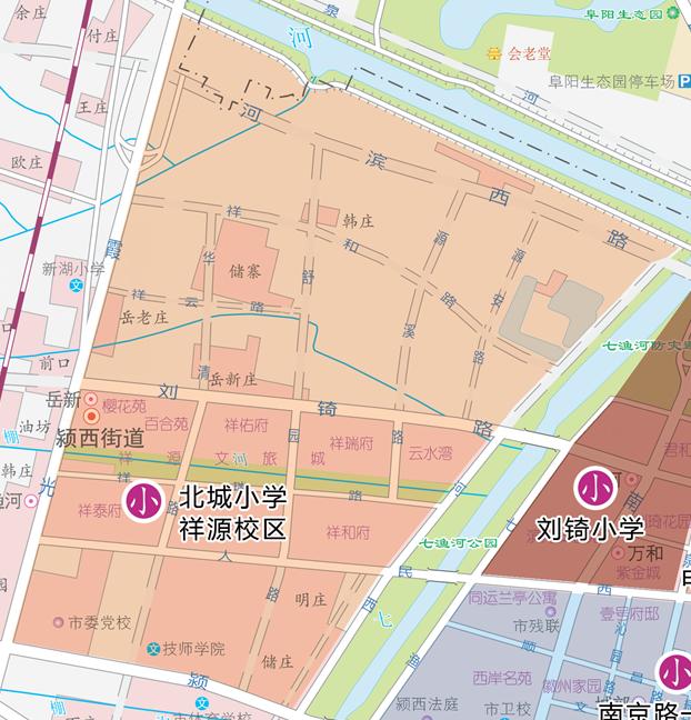 12.阜阳市刘锜小学:东至阜南路向西接窦棚沟向南接城泉路,南至人民西路,西至七渔河,北至河滨西路。