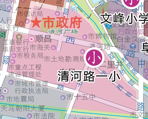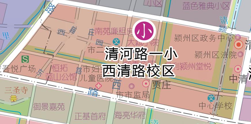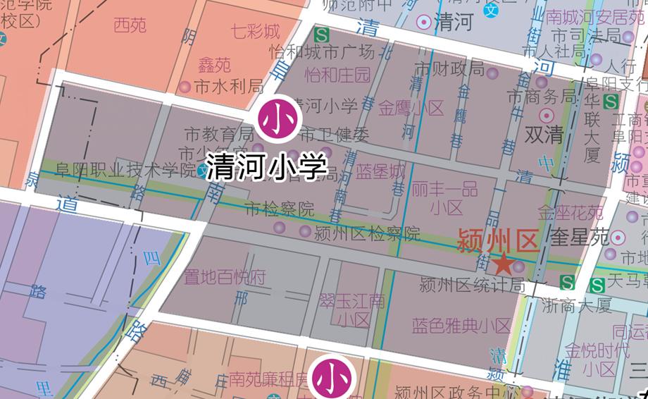 8.阜阳市清河路第一小学西清路校区:东至颍淮大道,南至淮河路,西至阜南路,北至颍南路。