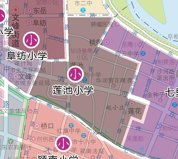 21.阜阳市莲池小学:西至颍上北路接二村路接清光路,南至永昌路、七里长沟,北至文峰路、桃园新村、时大庄,东至桃园东巷(西侧)、周庄东巷(西侧)、赵小庄。