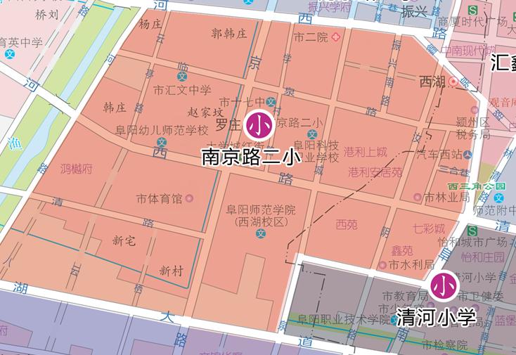 27.阜阳市南京路第二小学:东至鑫泉路接阜南路接双清路接城泉路,南至西湖大道,西至七渔河,北至颍河西路。
