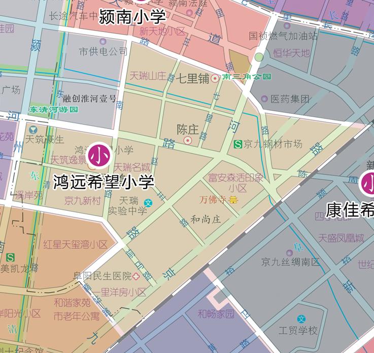 20.阜阳市颍州区文峰办事处中心学校东校区(阜阳市七里河小学):东至七里长沟,南至七里长沟,西至桃园东巷、周庄东巷、赵小庄,北至河滨东路。