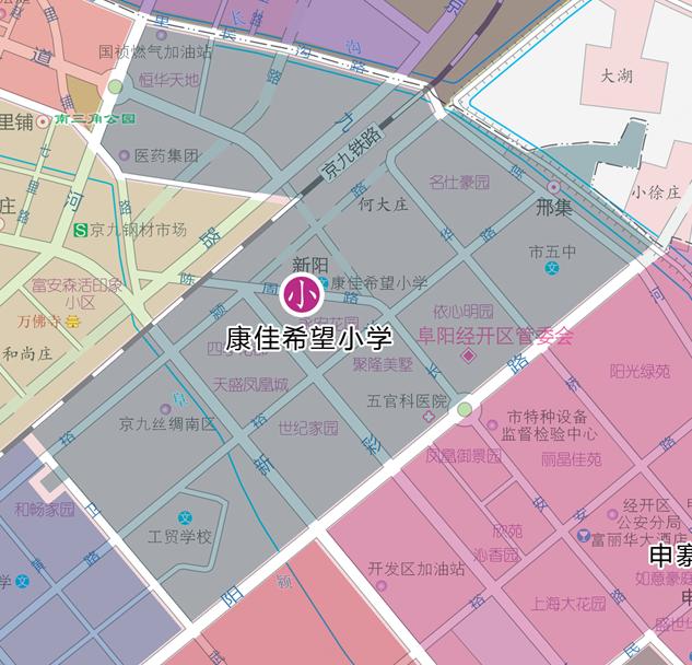 34.阜阳开发区京九路办事处康佳希望小学:东至新阳路,南到新阳社区南余庄,西到沙河路、医药集团,北至七里长沟(京九路街道办事处辖区)。