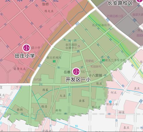37.阜阳开发区京九路办事处田庄小学:东至朝阳大道,南到复兴大道、南屏路张桥辖区,西至新阳路,北到新安路(所辖村庄有:刘寨、曹庄、田庄、前李大庄、后李大庄五个自然村),张桥社区。