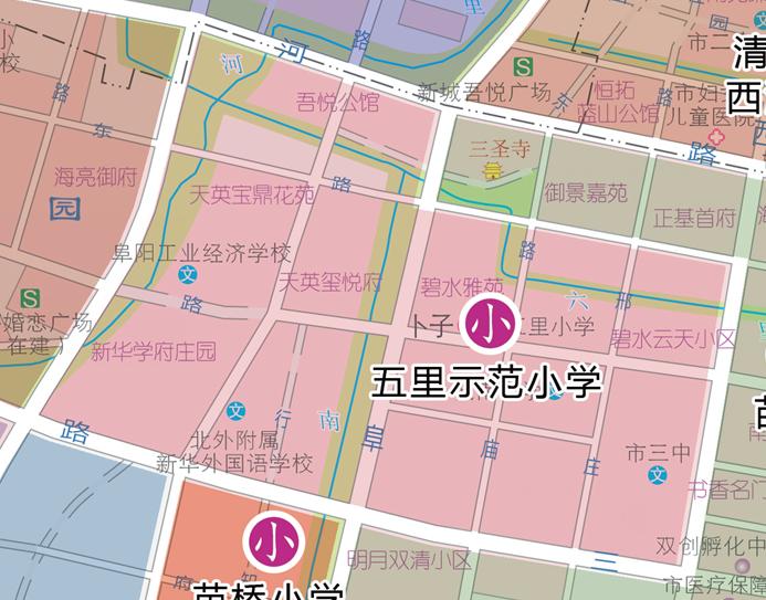 29.阜阳市颍州区清河街道办事处五里示范小学:北至淮河路,东接阜南路向东接卜子东路向南接西清路,南至三清路,西至南京路。